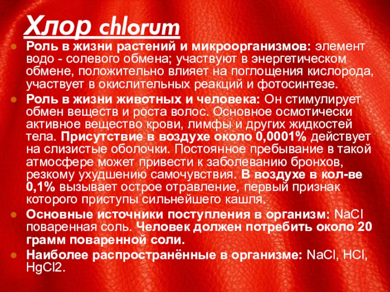 Роль в жизни животных и человека: Он стимулирует обмен веществ и роста волос. Основное осмотически активное вещество крови, лимфы и других жидкостей тела. Присутствие в воздухе около 0,0001% действует на слизистые оболочки. Постоянное пребывание в такой атмосфере может привести к заболеванию бронхов, резкому ухудшению самочувствия. В воздухе в кол-ве 0,1% вызывает острое отравление, первый признак которого приступы сильнейшего кашля.