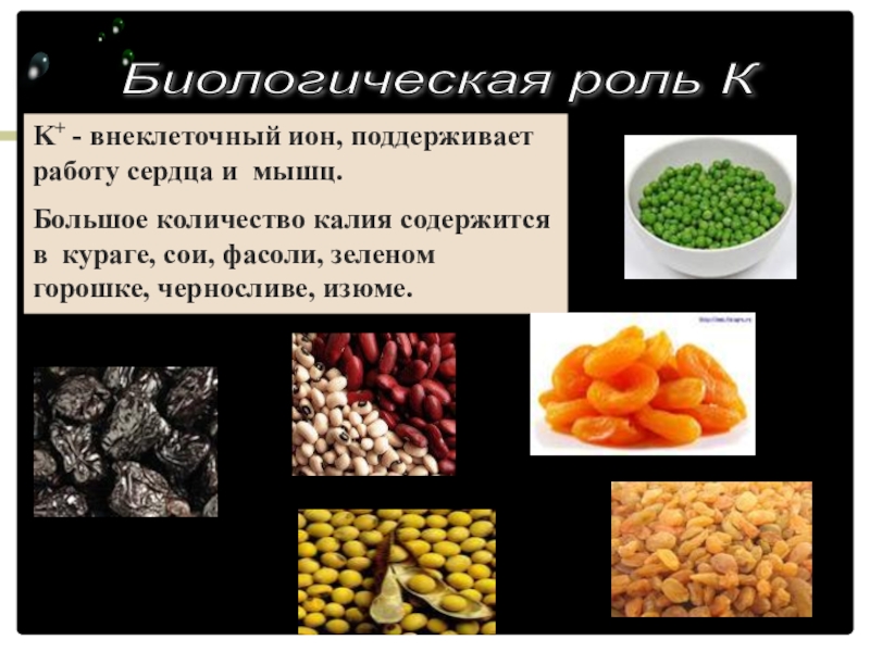 содержится в кураге, сои, фасоли, зеленом горошке, черносливе, изюме.