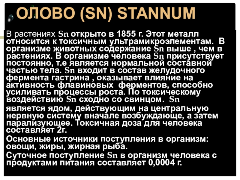 относится к токсичным ультрамикроэлементам. В организме животных содержание Sn выше , чем в растениях. В организме человека Sn присутствует постоянно, т.е является нормальной составной частью тела. Sn входит в состав желудочного фермента гастрина , оказывает влияние на активность флавиновых ферментов, способно усиливать процессы роста. По токсическому воздействию Sn сходно со свинцом. Sn