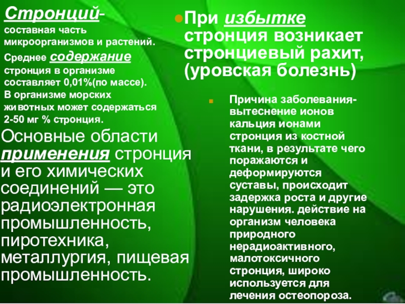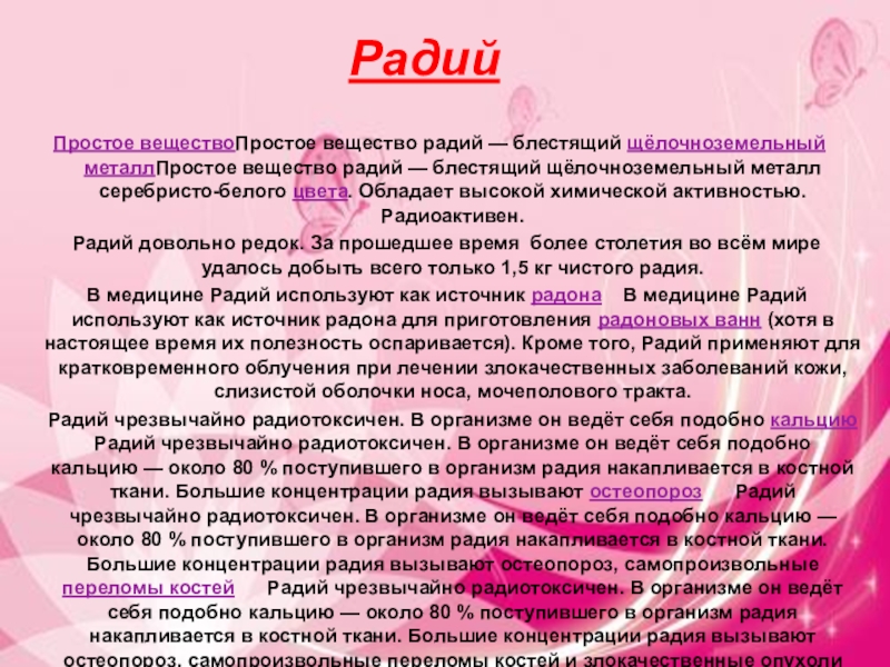 Радий чрезвычайно радиотоксичен. В организме он ведёт себя подобно кальцию Радий чрезвычайно радиотоксичен. В организме он ведёт себя подобно кальцию — около 80 % поступившего в организм радия накапливается в костной ткани. Большие концентрации радия вызывают остеопороз Радий чрезвычайно радиотоксичен. В организме он ведёт себя подобно кальцию — около 80 % поступившего в организм радия накапливается в костной ткани. Большие концентрации радия вызывают остеопороз, самопроизвольные переломы костей Радий чрезвычайно радиотоксичен. В организме он ведёт себя подобно кальцию — около 80 % поступившего в организм радия накапливается в костной ткани. Большие концентрации радия вызывают остеопороз, самопроизвольные переломы костей и злокачественные опухоли костей и кроветворной ткани Радий чрезвычайно радиотоксичен. В организме он ведёт себя подобно кальцию — около 80 % поступившего в организм радия накапливается в костной ткани. Большие концентрации радия вызывают остеопороз, самопроизвольные переломы костей и злокачественные опухоли костей и кроветворной ткани. Опасность представляет также радон — газообразный радиоактивный продукт распада радия.