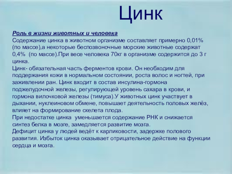 Цинк- обязательная часть ферментов крови. Он необходим для поддержания кожи в нормальном состоянии, роста волос и ногтей, при заживлении ран. Цинк входит в состав инсулина-гормона поджелудочной железы, регулирующей уровень сахара в крови, и гормона вилочковой железы (тимуса).У животных цинк участвует в дыхании, нуклеиновом обмене, повышает деятельность половых желёз, влияет на формирование скелета плода.