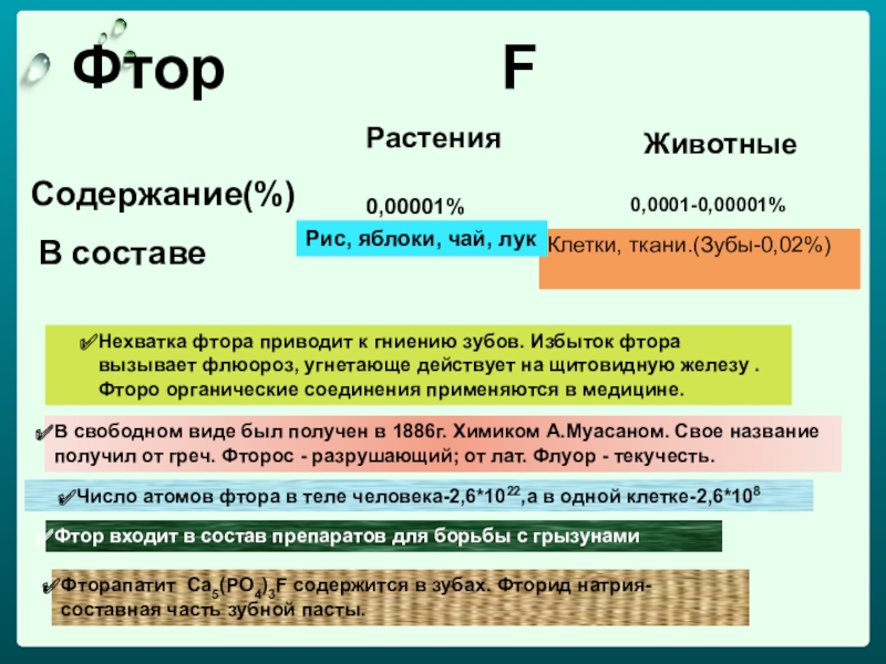 Роль в жизни человека и животных: участвует в окислительно-восстановительных процессах в синтезе витаминов В12 и Е, препятствует кариесу