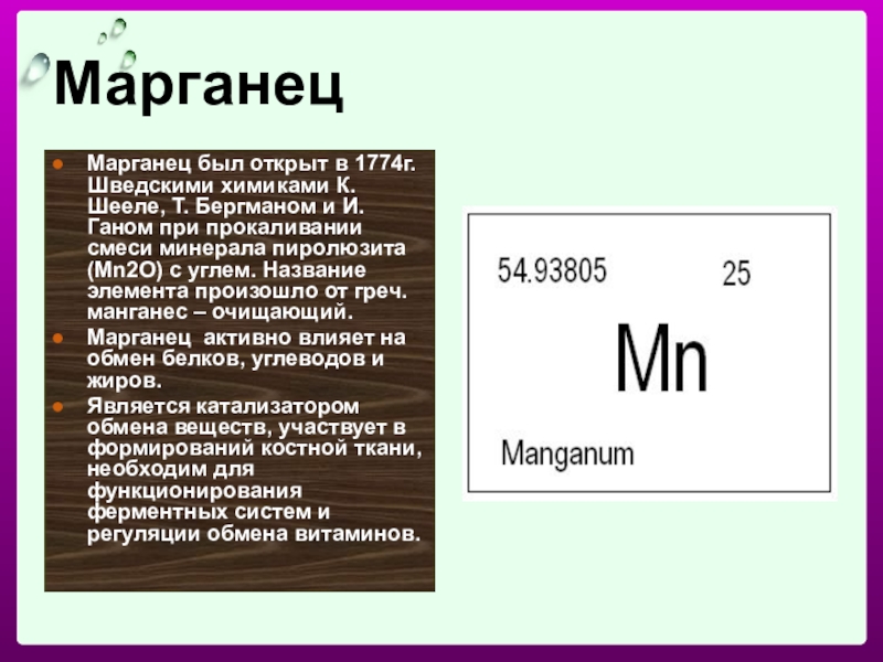 Марганец был открыт в 1774г. Шведскими химиками К. Шееле, Т. Бергманом