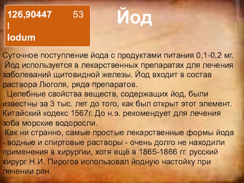 Целебные свойства веществ, содержащих йод, были известны за 3 тыс. лет до того, как был открыт этот элемент. Китайский кодекс 1567г. До н.э. рекомендует для лечения зоба морские водоросли.