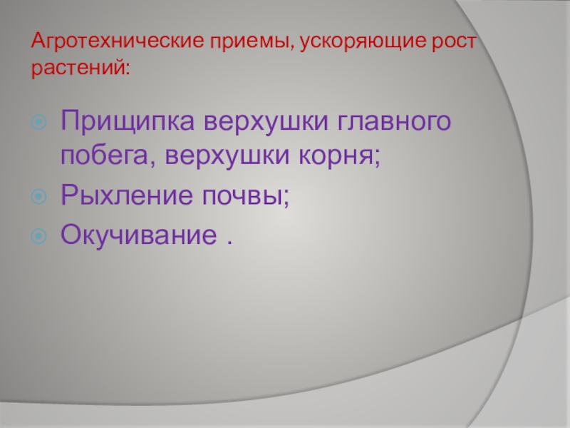 Агротехнические приемы, ускоряющие рост растений:Прищипка верхушки главного побега, верхушки корня;Рыхление почвы;Окучивание .