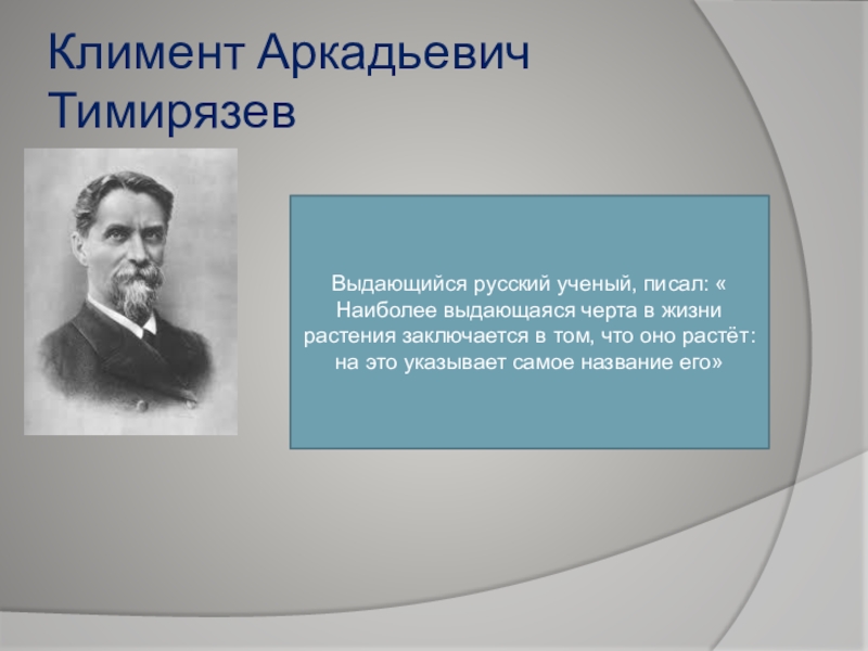 Климент Аркадьевич ТимирязевВыдающийся русский ученый, писал: « Наиболее выдающаяся черта в жизни растения заключается в том, что