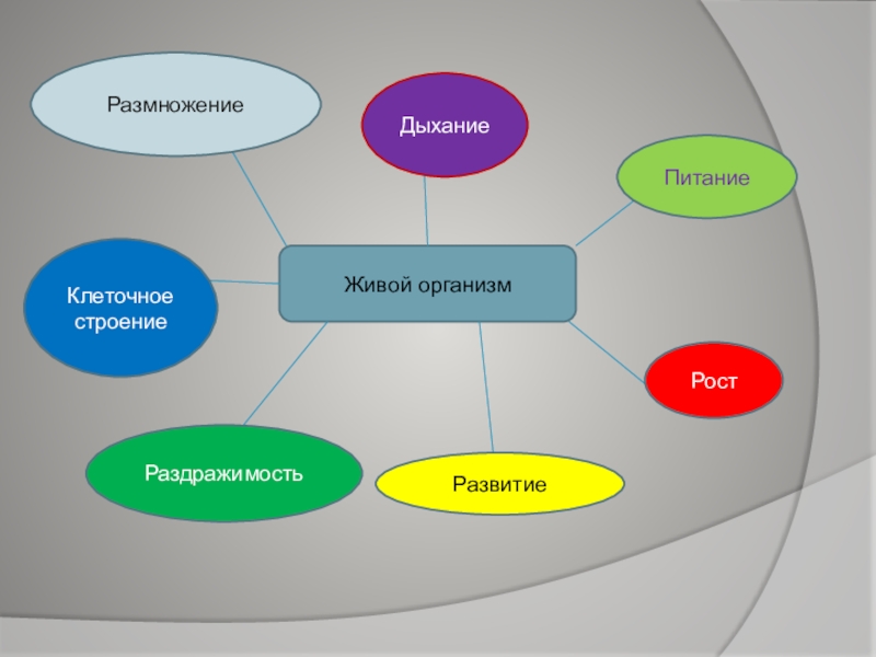 Живой организм ДыханиеПитаниеРостРазвитиеРаздражимостьКлеточное строениеРазмножение
