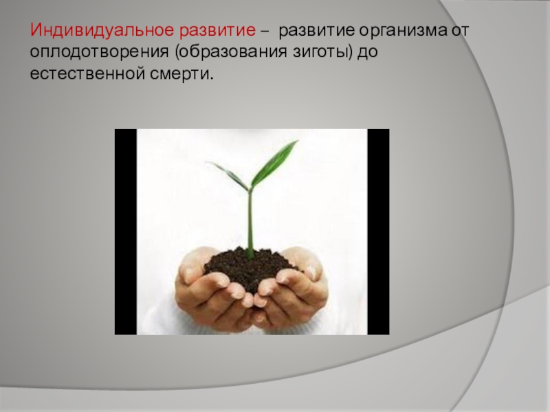 Слайд 9Индивидуальное развитие – развитие организма от оплодотворения (образования зиготы) до естественной