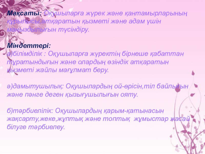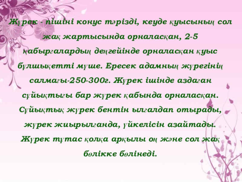 сұйықтық болады. Ол жүректің еркін жиырылуына жағдай жасап, үйкелісті азайтады. Жүрек 4 қуысты: 2 жүрекшеден және 2 қарыншадан тұрады.