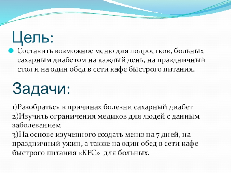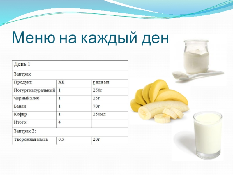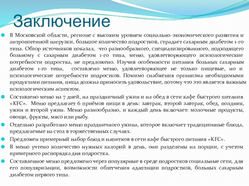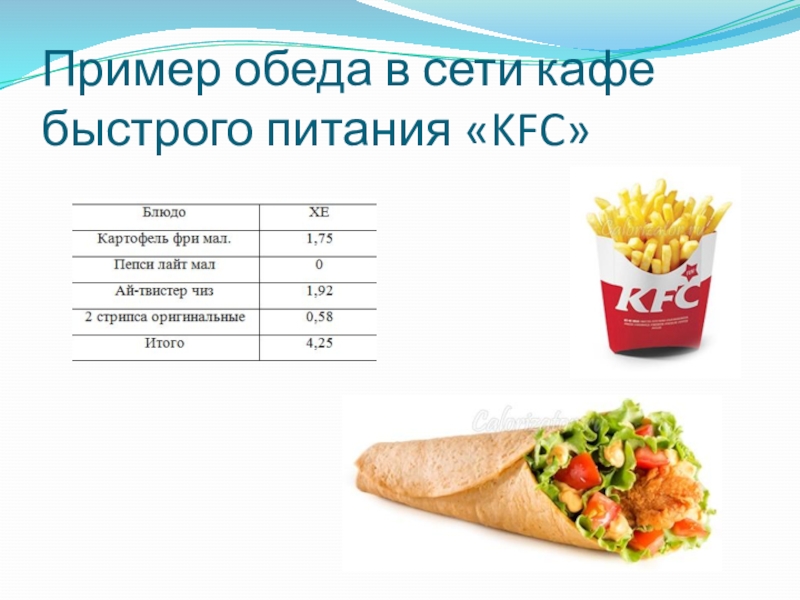 3)На основе изученного создать меню на 7 дней, на праздничный ужин, а также на один обед в сети кафе быстрого питания «KFC» для больных.