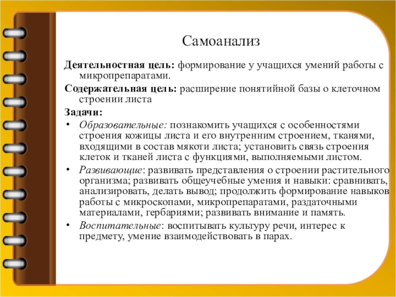 Образовательные: познакомить учащихся с особенностями строения кожицы листа и его внутренним строением, тканями, входящими в состав мякоти листа; установить связь строения клеток и тканей листа с функциями, выполняемыми листом.