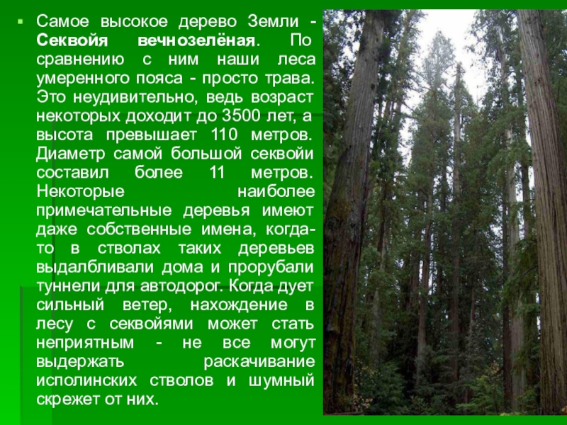 наши леса умеренного пояса - просто трава. Это неудивительно, ведь возраст некоторых доходит до 3500 лет, а высота превышает 110 метров. Диаметр самой большой секвойи составил более 11 метров. Некоторые наиболее примечательные деревья имеют даже собственные имена, когда-то в стволах таких деревьев выдалбливали дома и прорубали туннели для автодорог. Когда дует сильный ветер, нахождение в лесу с секвойями может стать неприятным - не все могут выдержать раскачивание исполинских стволов и шумный скрежет от них.