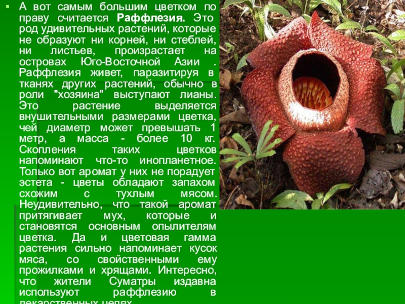 Слайд 7А вот самым большим цветком по праву считается Раффлезия. Это род