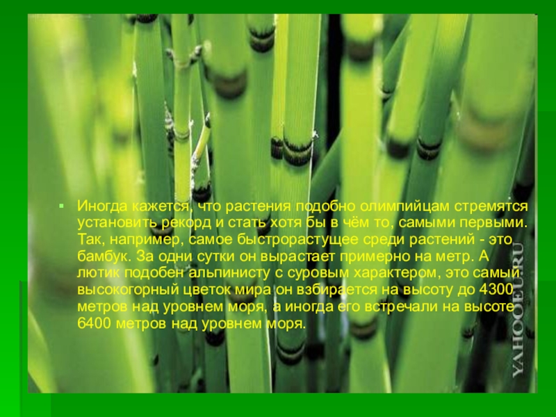 хотя бы в чём то, самыми первыми. Так, например, самое быстрорастущее среди растений - это бамбук. За одни сутки он вырастает примерно на метр. А лютик подобен альпинисту с суровым характером, это самый высокогорный цветок мира он взбирается на высоту до 4300 метров над уровнем моря, а иногда его встречали на высоте 6400 метров над уровнем моря.
