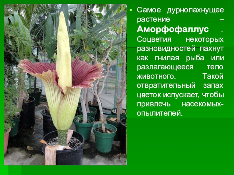 Слайд 12Самое дурнопахнущее растение – Аморфофаллус . Соцветия некоторых разновидностей пахнут как