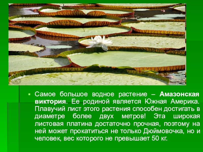 Слайд 13Самое большое водное растение – Амазонская виктория. Ее родиной является Южная