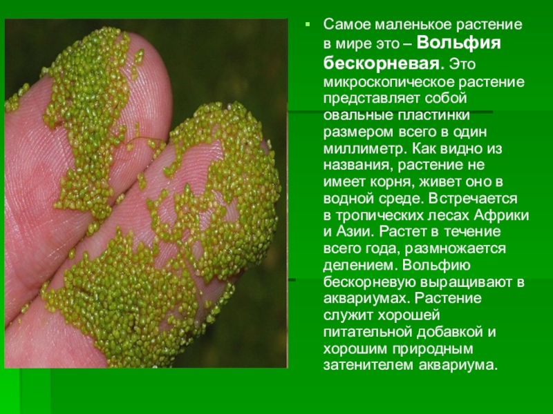 Слайд 6Самое маленькое растение в мире это – Вольфия бескорневая. Это микроскопическое растение