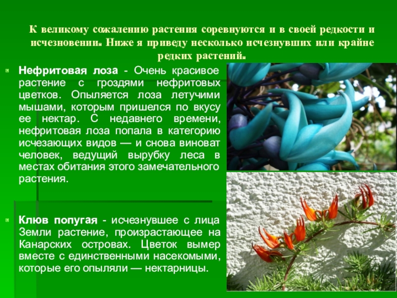 Нефритовая лоза - Очень красивое растение с гроздями нефритовых цветков. Опыляется лоза летучими мышами, которым пришелся по вкусу ее нектар. С недавнего времени, нефритовая лоза попала в категорию исчезающих видов — и снова виноват человек, ведущий вырубку леса в местах обитания этого замечательного растения.