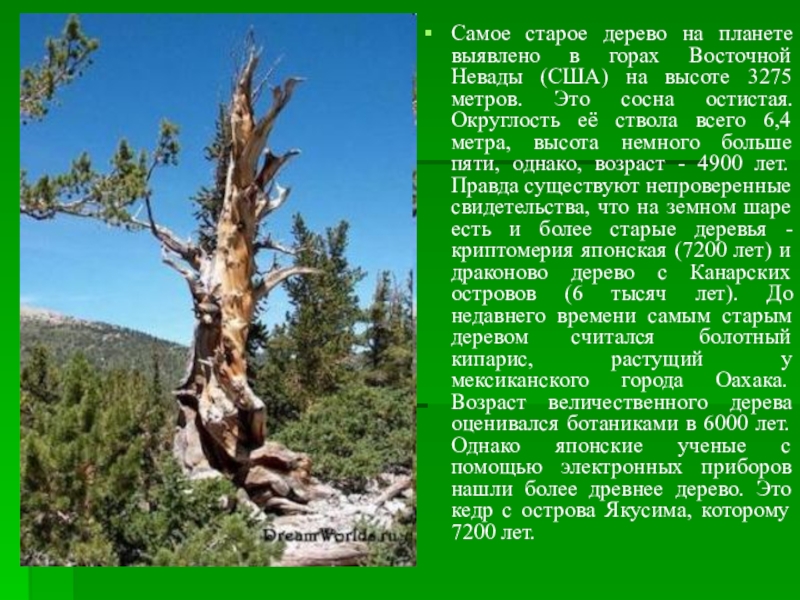 на высоте 3275 метров. Это сосна остистая. Округлость её ствола всего 6,4 метра, высота немного больше пяти, однако, возраст - 4900 лет. Правда существуют непроверенные свидетельства, что на земном шаре есть и более старые деревья - криптомерия японская (7200 лет) и драконово дерево с Канарских островов (6 тысяч лет). До недавнего времени самым старым деревом считался болотный кипарис, растущий у мексиканского города Оахака. Возраст величественного дерева оценивался ботаниками в 6000 лет. Однако японские ученые с помощью электронных приборов нашли более древнее дерево. Это кедр с острова Якусима, которому 7200 лет.