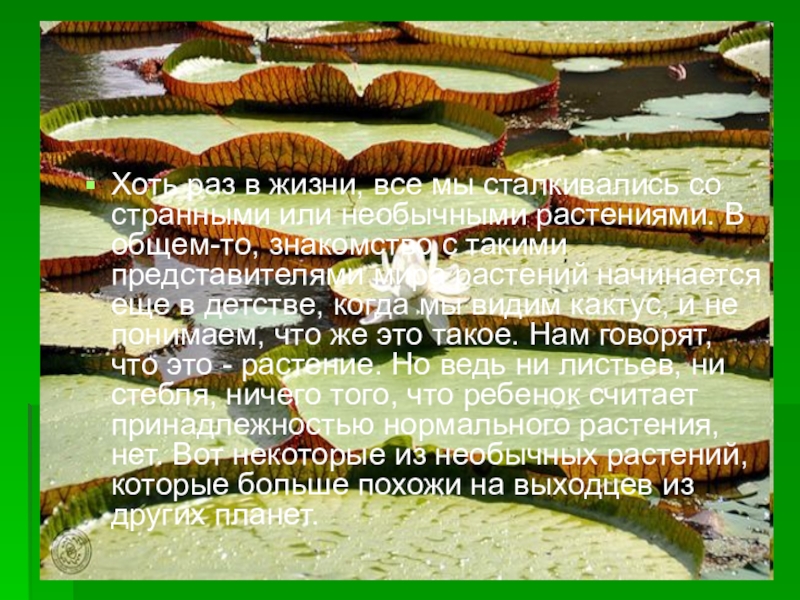 растениями. В общем-то, знакомство с такими представителями мира растений начинается еще в детстве, когда мы видим кактус, и не понимаем, что же это такое. Нам говорят, что это - растение. Но ведь ни листьев, ни стебля, ничего того, что ребенок считает принадлежностью нормального растения, нет. Вот некоторые из необычных растений, которые больше похожи на выходцев из других планет.
