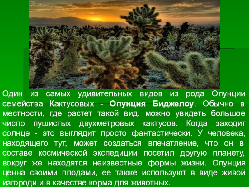 Опунция Биджелоу. Обычно в местности, где растет такой вид, можно увидеть большое число пушистых двухметровых кактусов. Когда заходит солнце - это выглядит просто фантастически. У человека, находящего тут, может создаться впечатление, что он в составе космической экспедиции посетил другую планету, вокруг же находятся неизвестные формы жизни. Опунция ценна своими плодами, ее также используют в виде живой изгороди и в качестве корма для животных.