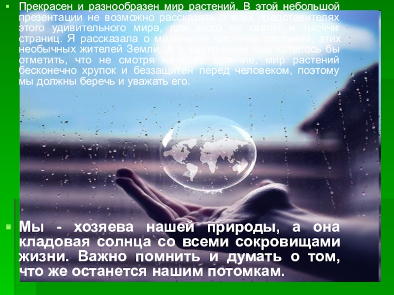 рассказать о всех представителях этого удивительного мира, для этого не хватит и тысячи страниц. Я рассказала о маленькой частичке растений, этих необычных жителей Земли. А в заключении мне хотелось бы отметить, что не смотря на своё величие, мир растений бесконечно хрупок и беззащитен перед человеком, поэтому мы должны беречь и уважать его.