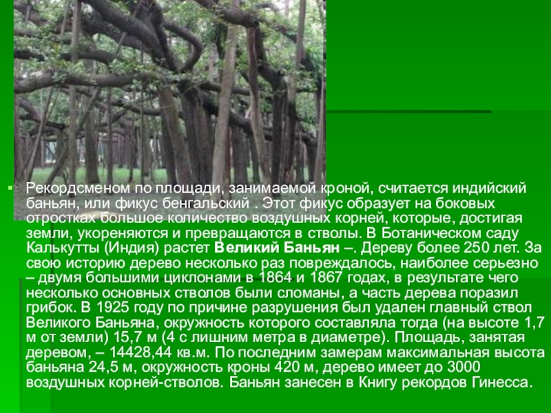Слайд 15Рекордсменом по площади, занимаемой кроной, считается индийский баньян, или фикус бенгальский