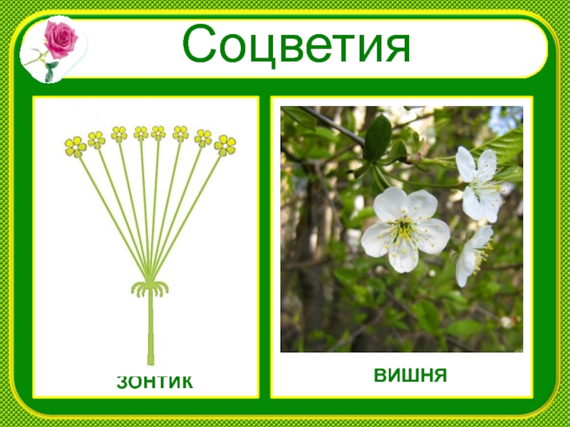 Цветки розоцветных — одиночные (роза) или собраны в соцветия (кисть у черемухи, щиток у груши).