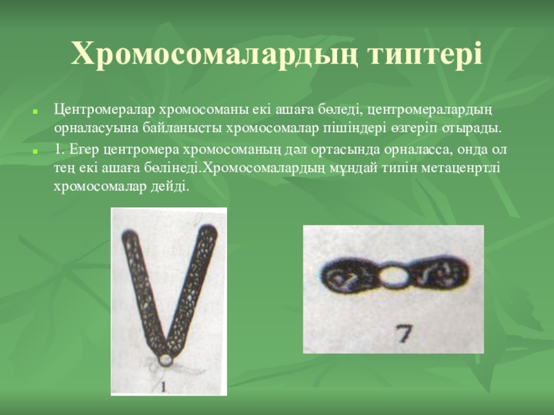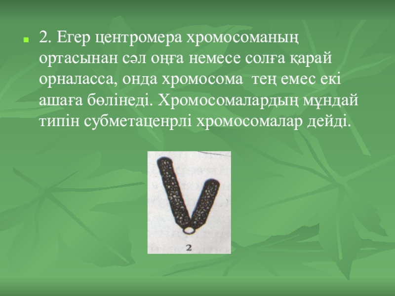 1. Егер центромера хромосоманың дәл ортасында орналасса, онда ол тең екі ашаға бөлінеді.Хромосомалардың мұндай типін метаценртлі хромосомалар дейді.