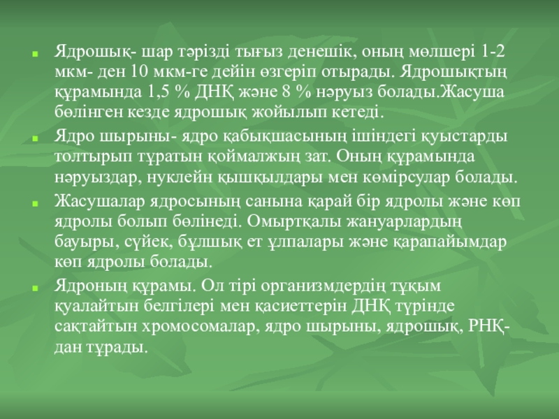 Ядроның құрамы. Ол тірі организмдердің тұқым қуалайтын белгілері мен қасиеттерін ДНҚ түрінде сақтайтын хромосомалар, ядро шырыны, ядрошық, РНҚ- дан тұрады.