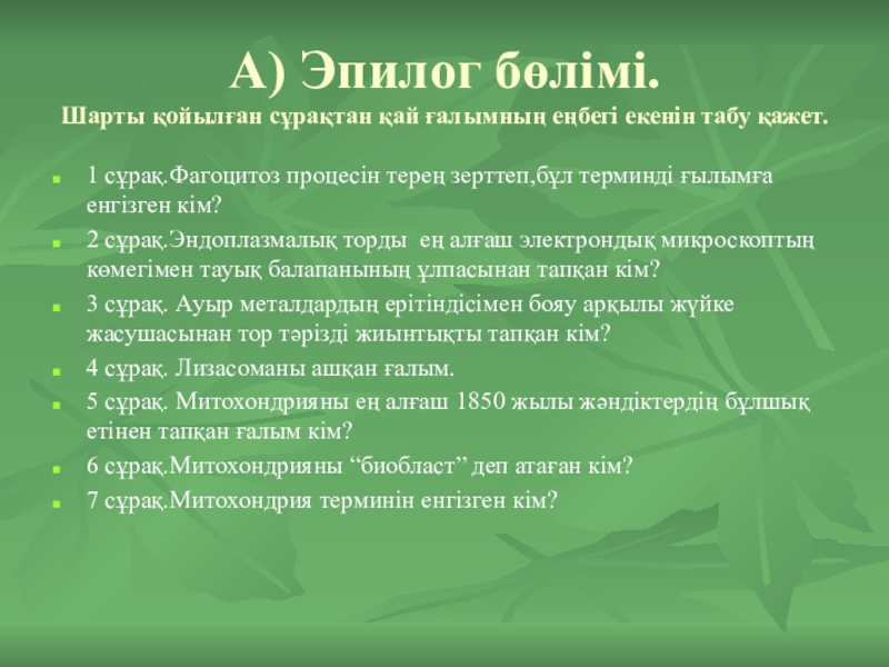 Шарты қойылған сұрақтан қай ғалымның еңбегі екенін табу қажет.