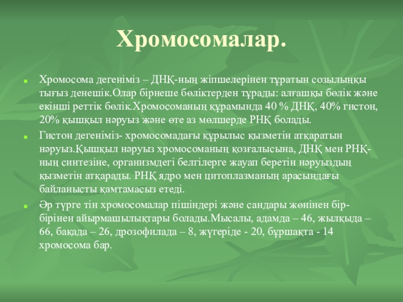 Хромосома дегеніміз – ДНҚ-ның жіпшелерінен тұратын созылыңқы тығыз денешік.Олар бірнеше бөліктерден
