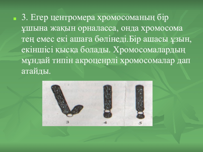 Слайд 103. Егер центромера хромосоманың бір ұшына жақын орналасса, онда хромосома тең