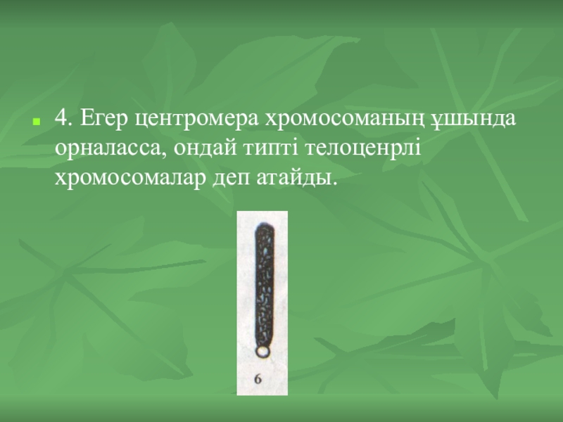 Слайд 114. Егер центромера хромосоманың ұшында орналасса, ондай типті телоценрлі хромосомалар деп
