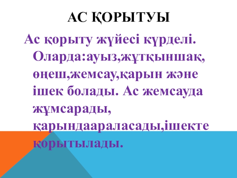 АС ҚОРЫТУЫАс қорыту жүйесі күрделі. Оларда:ауыз,жұтқыншақ,өңеш,жемсау,қарын және ішек болады. Ас жемсауда жұмсарады,қарындаараласады,ішекте қорытылады.
