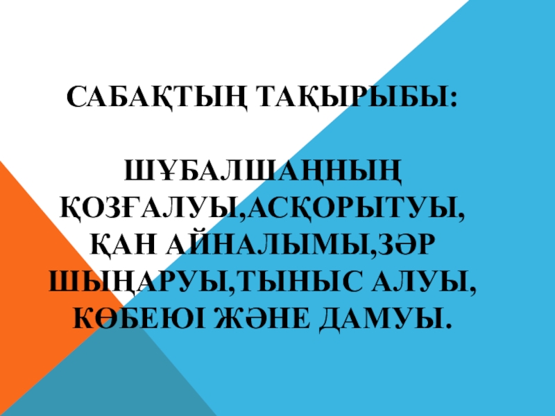 Слайд 1САБАҚТЫҢ ТАҚЫРЫБЫ: ШҰБАЛШАҢНЫҢ ҚОЗҒАЛУЫ,АСҚОРЫТУЫ, ҚАН АЙНАЛЫМЫ,ЗӘР ШЫҢАРУЫ,ТЫНЫС АЛУЫ,КӨБЕЮІ ЖӘНЕ ДАМУЫ.