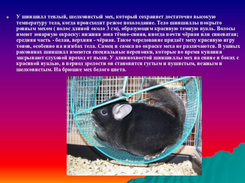когда происходит резкое похолодание. Тело шиншиллы покрыто ровным мехом ( волос длиной около 3 см), образующим красивую темную вуаль. Волосы имеют зонарную окраску: нижняя зона тёмно-синяя, иногда почти чёрная или синеватая; средняя часть - белая, верхняя - чёрная. Такое чередование придаёт меху красивую игру тонов, особенно на изгибах тела. Самец и самка по окраске меха не различаются. В ушных раковинах шиншилл имеются специальные перепонки, которые во время купания закрывают слуховой проход от пыли. У длиннохвостой шиншиллы мех на спине и боках с красивой вуалью, в период зрелости он становится густым и пушистым, нежным и шелковистым. На брюшке мех белого цвета.