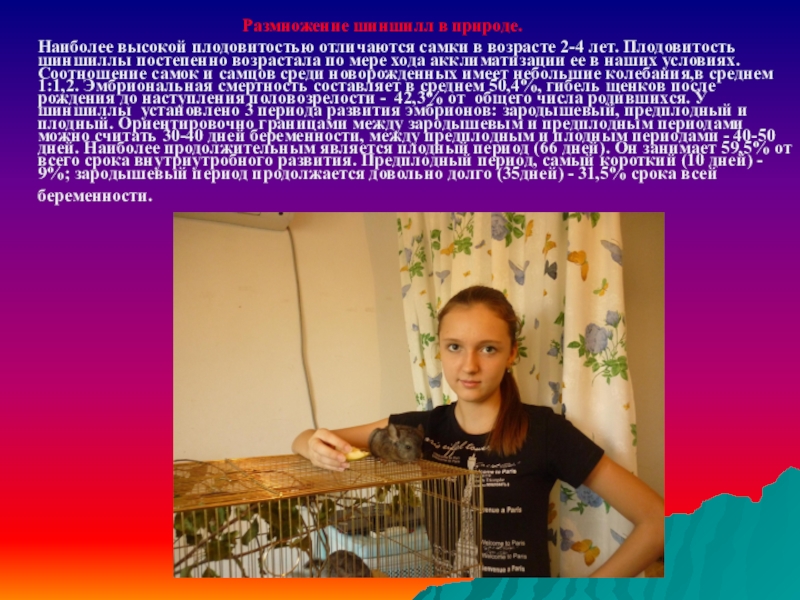 Наиболее высокой плодовитостью отличаются самки в возрасте 2-4 лет. Плодовитость шиншиллы постепенно возрастала по мере хода акклиматизации ее в наших условиях. Соотношение самок и самцов среди новорожденных имеет небольшие колебания,в среднем 1:1,2. Эмбриональная смертность составляет в среднем 50,4%, гибель щенков после рождения до наступления половозрелости - 42,3% от общего числа родившихся. У шиншиллы установлено 3 периода развития эмбрионов: зародышевый, предплодный и плодный. Ориентировочно границами между зародышевым и предплодным периодами можно считать 30-40 дней беременности, между предплодным и плодным периодами - 40-50 дней. Наиболее продолжительным является плодный период (66 дней). Он занимает 59,5% от всего срока внутриутробного развития. Предплодный период, самый короткий (10 дней) - 9%; зародышевый период продолжается довольно долго (35дней) - 31,5% срока всей беременности.