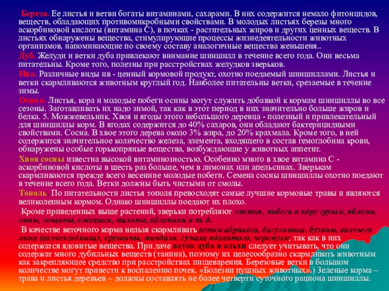 В качестве веточного корма нельзя скармливать ветки абрикоса, багульника, бузины, волчьего лыка (волчеягодника), крушины, миндаля, сумаха ядовитого, черемухи, так как в них содержатся ядовитые вещества. При даче веток дуба и ольхи следует учитывать, что они содержат много дубильных веществ (танина), поэтому их целесообразно скармливать животным как закрепляющее средство при расстройствах пищеварения. Березовые ветки в большом количестве могут привести к воспалению почек. «Болезни пушных животных».) Зеленые корма – трава и листья деревьев – должны составлять не более четверти суточного рациона шиншиллы.