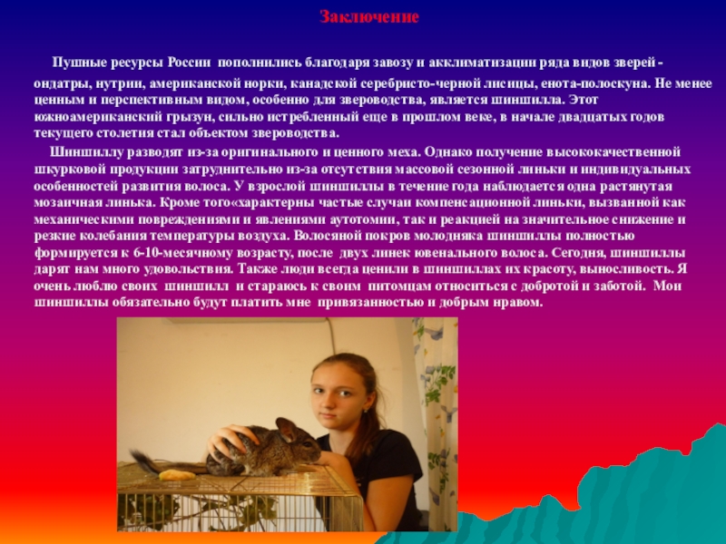 Шиншиллу разводят из-за оригинального и ценного меха. Однако получение высококачественной шкурковой продукции затруднительно из-за отсутствия массовой сезонной линьки и индивидуальных особенностей развития волоса. У взрослой шиншиллы в течение года наблюдается одна растянутая мозаичная линька. Кроме того«характерны частые случаи компенсационной линьки, вызванной как механическими повреждениями и явлениями аутотомии, так и реакцией на значительное снижение и резкие колебания температуры воздуха. Волосяной покров молодняка шиншиллы полностью формируется к 6-10-месячному возрасту, после двух линек ювенального волоса. Сегодня, шиншиллы дарят нам много удовольствия. Также люди всегда ценили в шиншиллах их красоту, выносливость. Я очень люблю своих шиншилл и стараюсь к своим питомцам относиться с добротой и заботой. Мои шиншиллы обязательно будут платить мне привязанностью и добрым нравом.