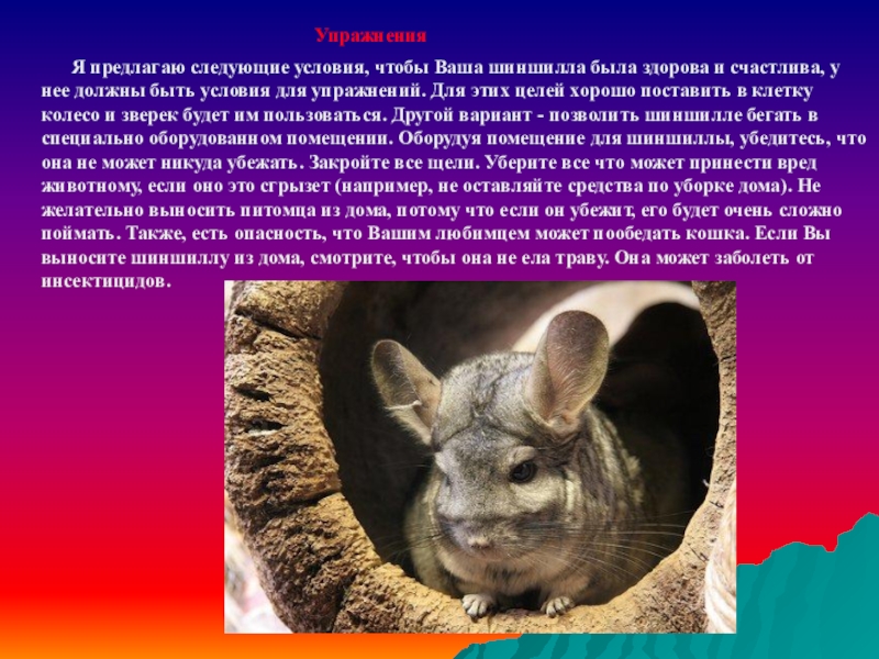 Я предлагаю следующие условия, чтобы Ваша шиншилла была здорова и счастлива, у нее должны быть условия для упражнений. Для этих целей хорошо поставить в клетку колесо и зверек будет им пользоваться. Другой вариант - позволить шиншилле бегать в специально оборудованном помещении. Оборудуя помещение для шиншиллы, убедитесь, что она не может никуда убежать. Закройте все щели. Уберите все что может принести вред животному, если оно это сгрызет (например, не оставляйте средства по уборке дома). Не желательно выносить питомца из дома, потому что если он убежит, его будет очень сложно поймать. Также, есть опасность, что Вашим любимцем может пообедать кошка. Если Вы выносите шиншиллу из дома, смотрите, чтобы она не ела траву. Она может заболеть от инсектицидов.