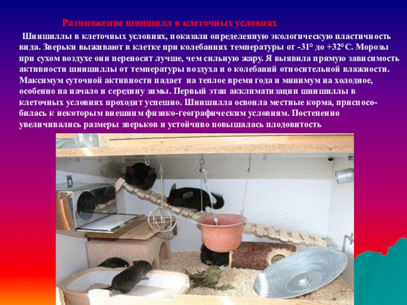 Шиншиллы в клеточных условиях, показали определенную экологическую пластичность вида. Зверьки выживают в клетке при колебаниях температуры от -31° до +32°С. Морозы при сухом воздухе они переносят лучше, чем сильную жару. Я выявила прямую зависимость активности шиншиллы от температуры воздуха и о колебаний относительной влажности. Максимум суточной активности падает на теплое время года и минимум на холодное, особенно на начало и середину зимы. Первый этап акклиматизации шиншиллы в клеточных условиях проходит успешно. Шиншилла освоила местные корма, приспосо-билась к некоторым внешним физико-географическим условиям. Постепенно увеличивались размеры зверьков и устойчиво повышалась плодовитость