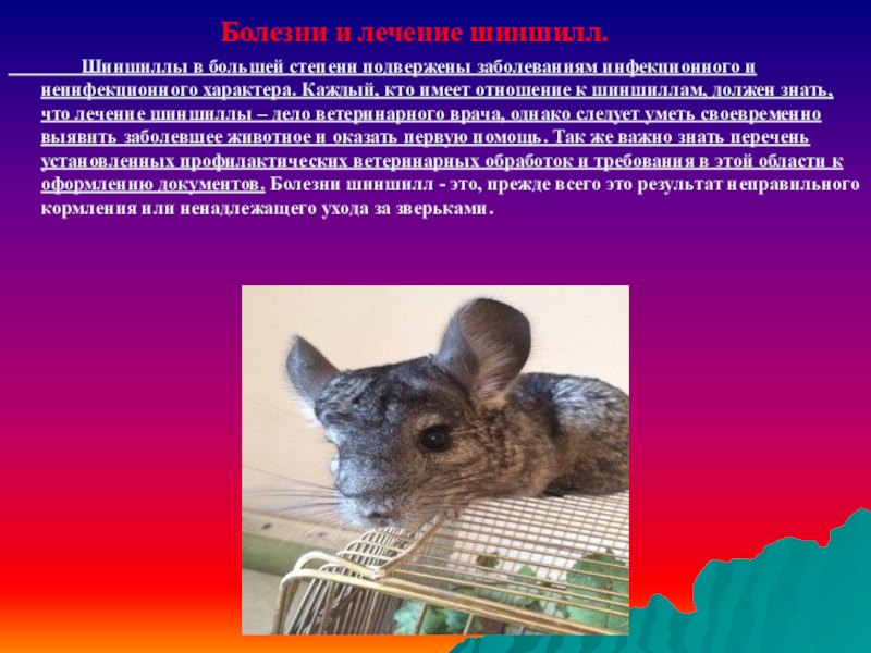 Шиншиллы в большей степени подвержены заболеваниям инфекционного и неинфекционного характера. Каждый, кто имеет отношение к шиншиллам, должен знать, что лечение шиншиллы – дело ветеринарного врача, однако следует уметь своевременно выявить заболевшее животное и оказать первую помощь. Так же важно знать перечень установленных профилактических ветеринарных обработок и требования в этой области к оформлению документов. Болезни шиншилл - это, прежде всего это результат неправильного кормления или ненадлежащего ухода за зверьками.