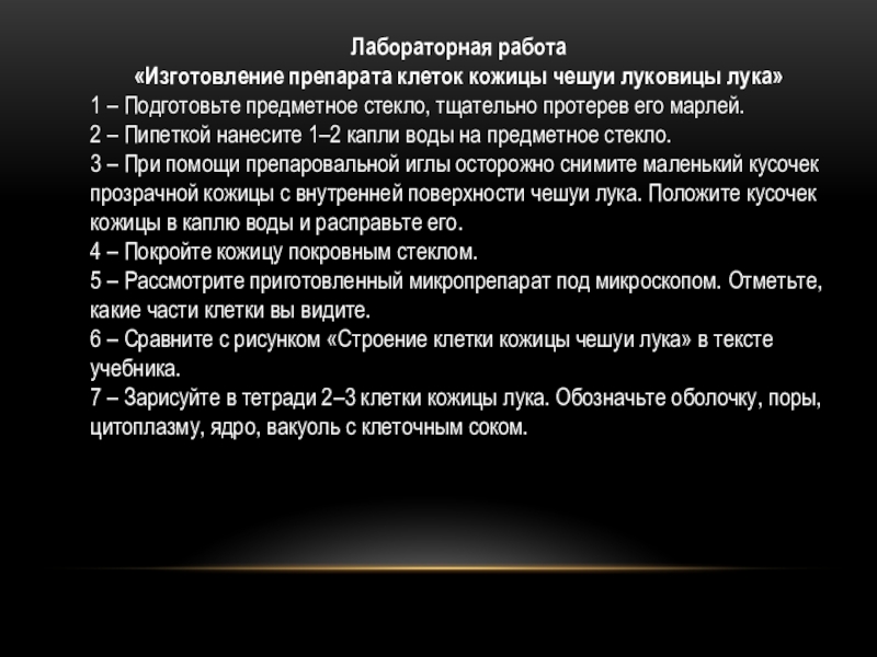 Лабораторная работа «Изготовление препарата клеток кожицы чешуи луковицы лука»1 – Подготовьте предметное стекло, тщательно протерев его марлей.2 – Пипеткой нанесите 1–2