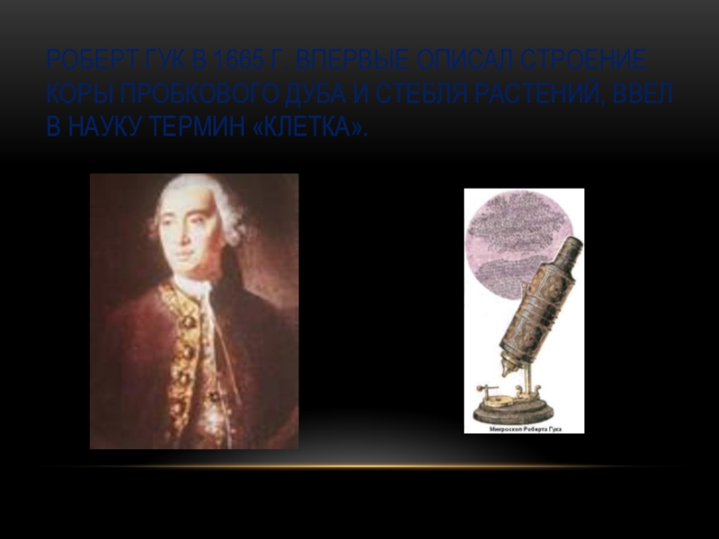 РОБЕРТ ГУК В 1665 Г. ВПЕРВЫЕ ОПИСАЛ СТРОЕНИЕ КОРЫ ПРОБКОВОГО ДУБА И СТЕБЛЯ РАСТЕНИЙ, ВВЕЛ В НАУКУ