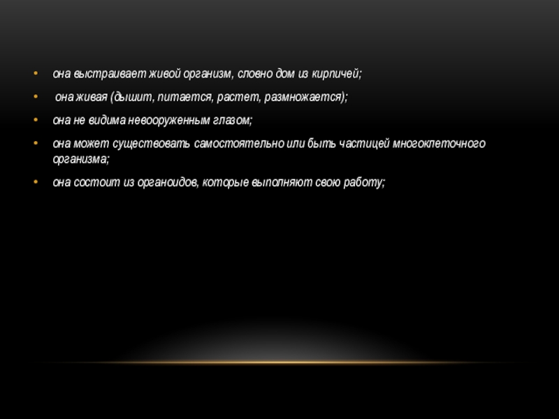 она выстраивает живой организм, словно дом из кирпичей; она живая (дышит, питается, растет, размножается);она не видима невооруженным
