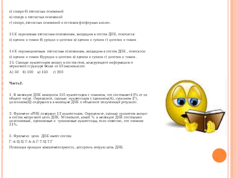 а) нуклеозиды б) нуклеотиды в) полинуклеотиды г) азотистые основания.