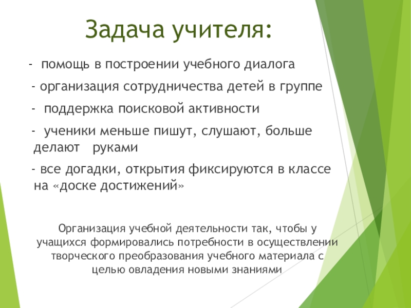 Организация учебной деятельности так, чтобы у учащихся формировались потребности в осуществлении творческого преобразования учебного материала с целью овладения новыми знаниями