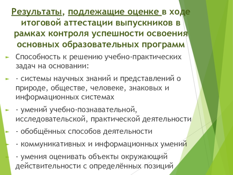 Слайд 20Результаты, подлежащие оценке в ходе итоговой аттестации выпускников в рамках контроля