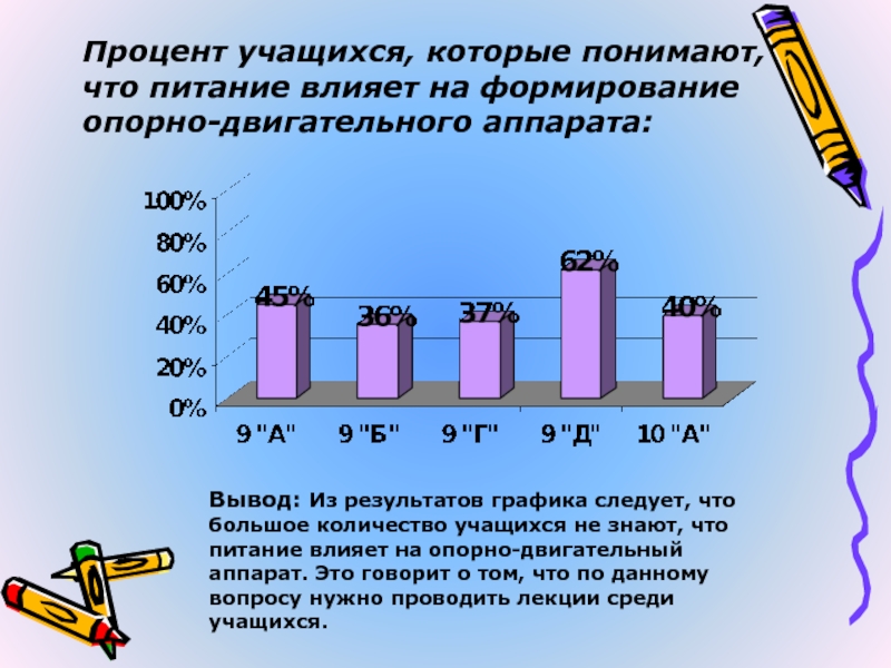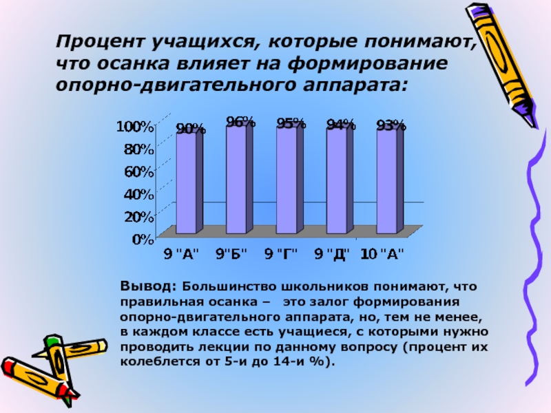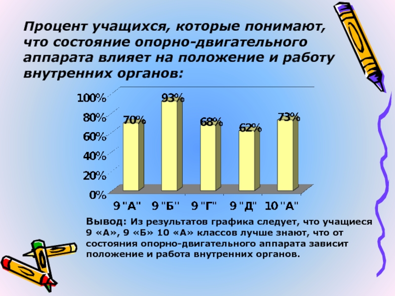 Вывод: Из результатов графика следует, что учащиеся 9 «А», 9 «Б» 10 «А» классов лучше знают, что от состояния опорно-двигательного аппарата зависит положение и работа внутренних органов.